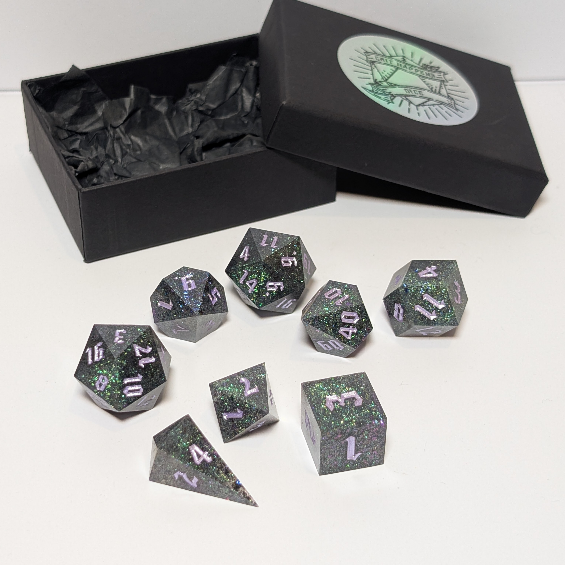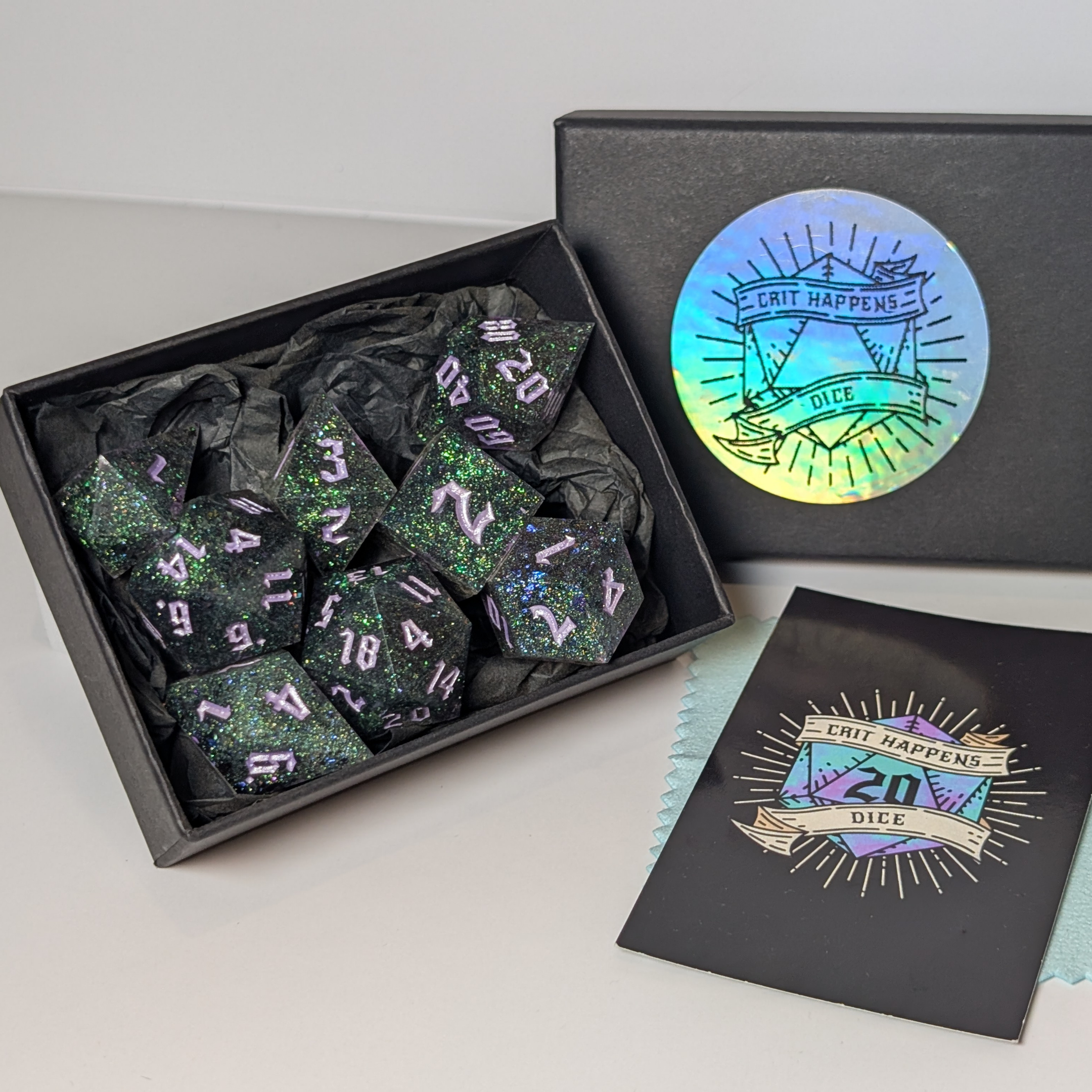 - Each dice set comes ready packaged in its own box lined with tissue paper and includes a cleaning cloth, making it perfect to gift to a fellow dice goblin or to keep for yourself.