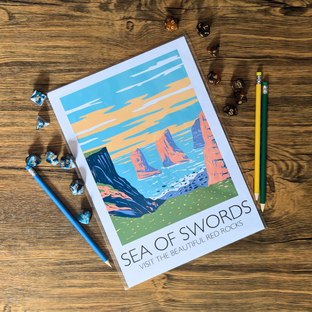 A4 location poster for the Sea of Swords in a retro British train travel style