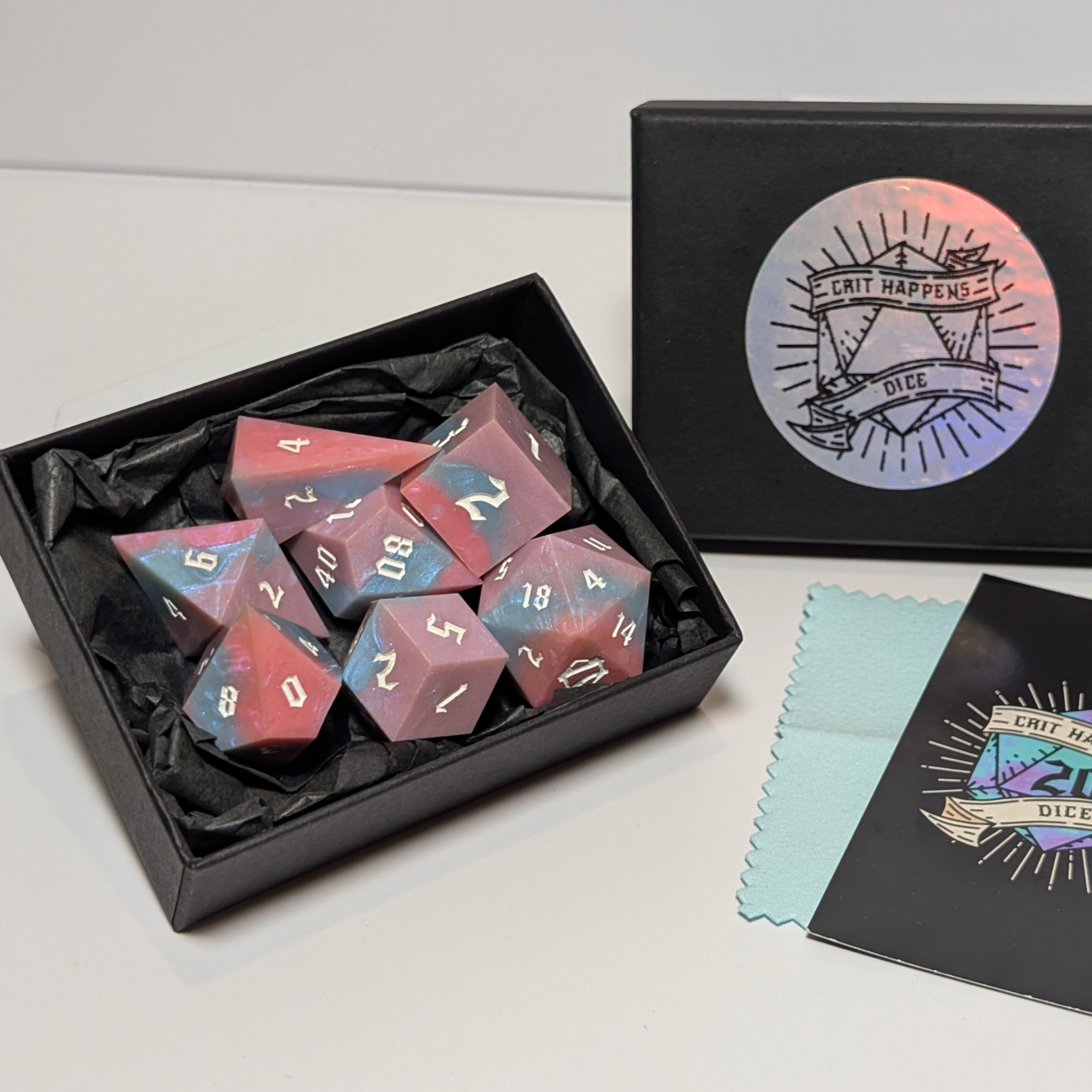 • Each dice set comes ready packaged in its own box lined with tissue paper and includes a cleaning cloth, making it perfect to gift to a fellow dice goblin or to keep for yourself.