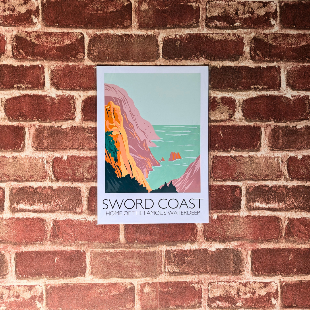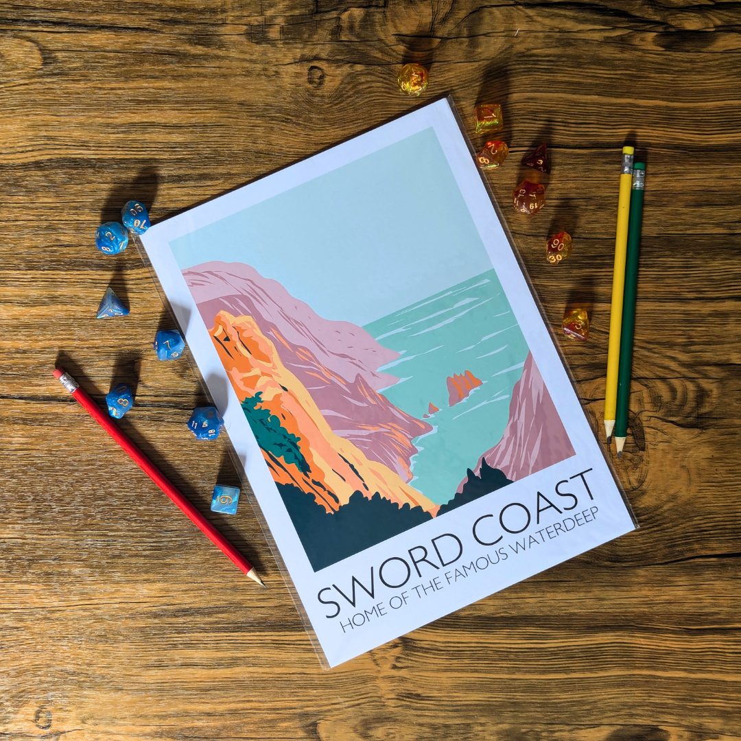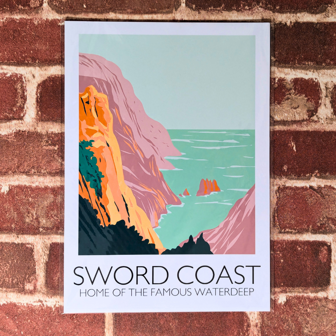 Perfect memento for your epic adventures, this print captures key locations from Dungeons and Dragons adventure settings in a retro British train travel poster style.